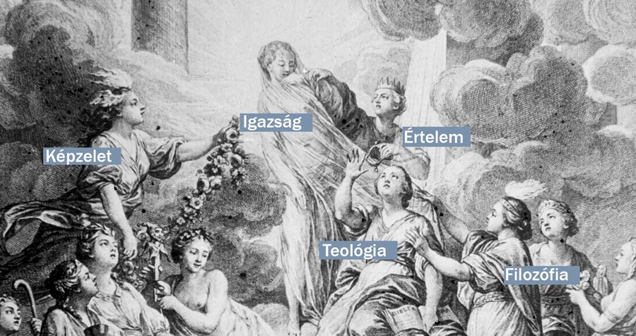 A képen a francia Enciklopédia belső borítója látható, az allegorikus alakok megnevezésével. A mozgalmas jelenetben a felvilágosodás szellemi erői, az Értelem, a Filozófia és a Képzelet közösen rántják le a leplet az Igazságról. Közben elcsenik a teológia fejéről a koronát, amellyel (feltehetően) az Igazságot kívánják megtisztelni.