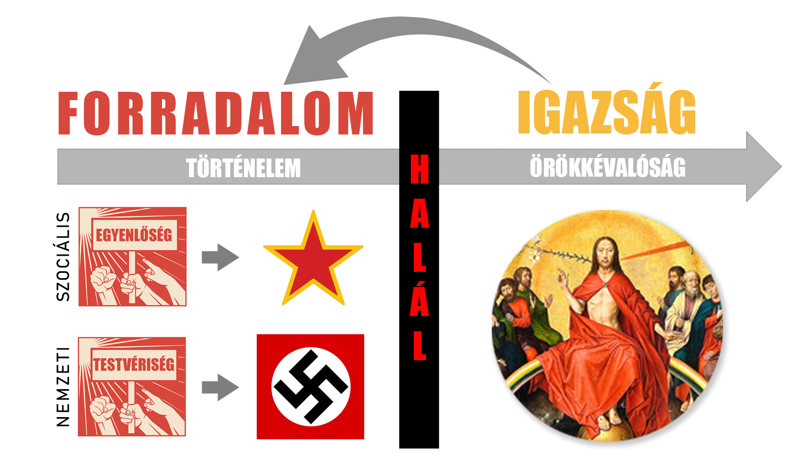 Ha az igazságot, ezt a gyönyörű keresztény utópiát erőszakkal rángatod bele a történelembe, akkor száraz jelszavakká silányul. Az „egyenlőség” és a „testvériség” csak torz, erőszakos változatai a végső, isteni igazságnak. Az előbbi szociális alapon, az utóbbi nemzeti alapon kívánja megvalósítani saját utópiáját. Aztán végül csak felgyújtják a világot.