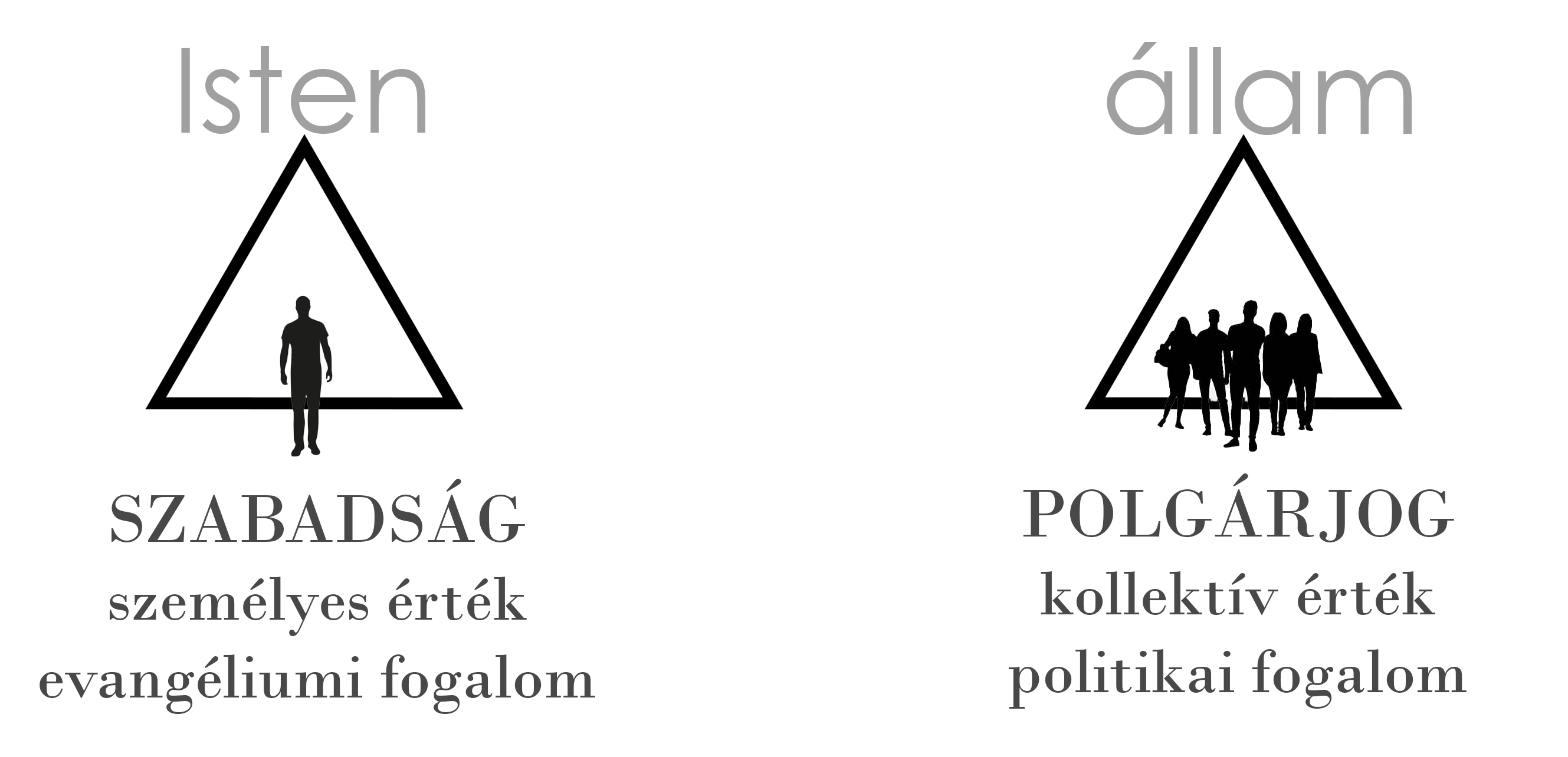 A bal oldali ábra érzékelteti, hogy a szabadság a személynek és Istennek ügye. A szabadság kizárólag a lélek belső univerzumában értelmezhető, ahol az ember egyedül Istennek mint teremtő atyjának felel.